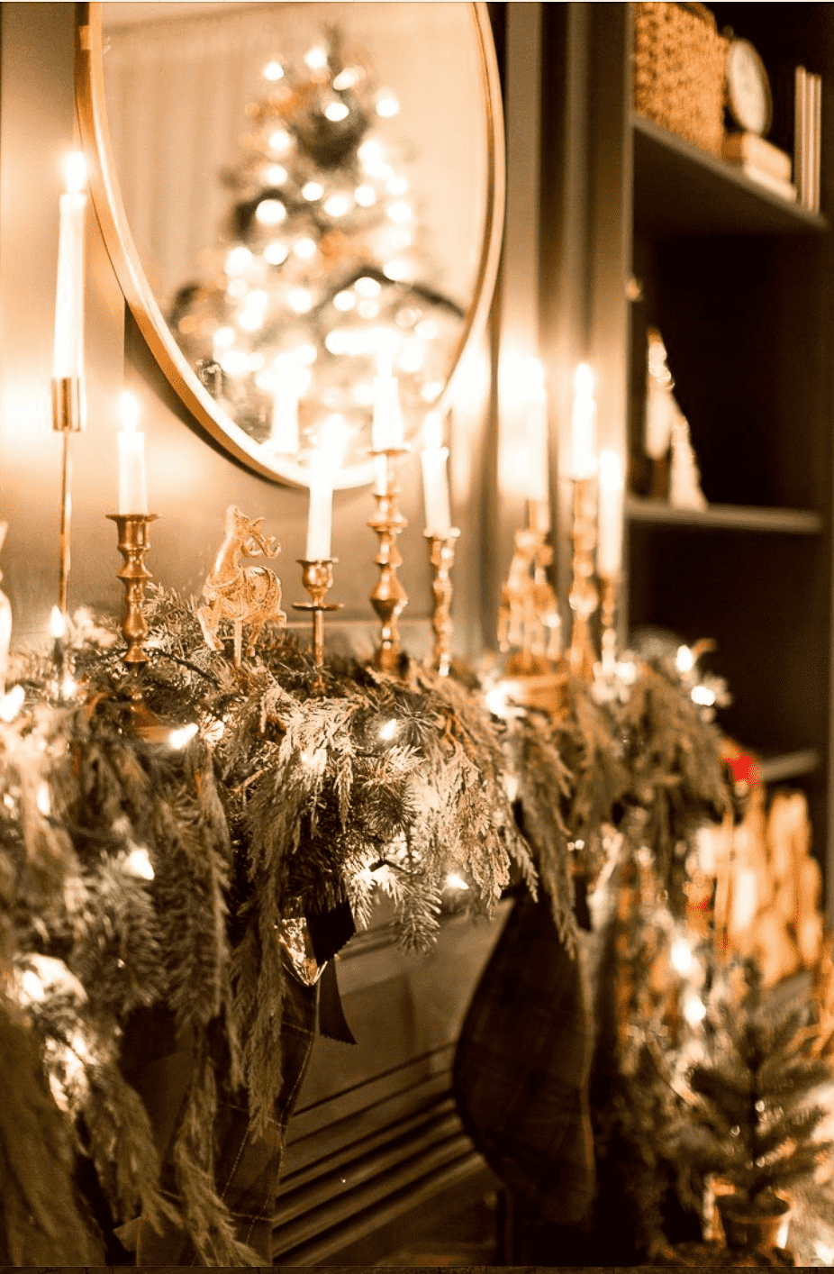 Un espejo dorado es una opción para dar el toque dorado que necesita una decoración navideña tradicional. Decóralo con ramas, piñas y otros elementos naturales para conseguir un ambiente agradable.