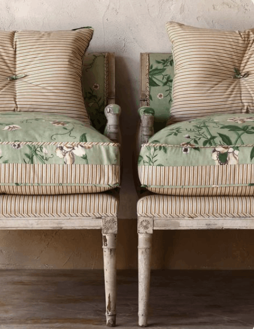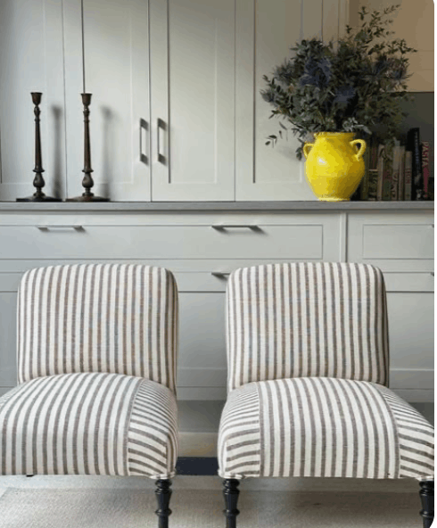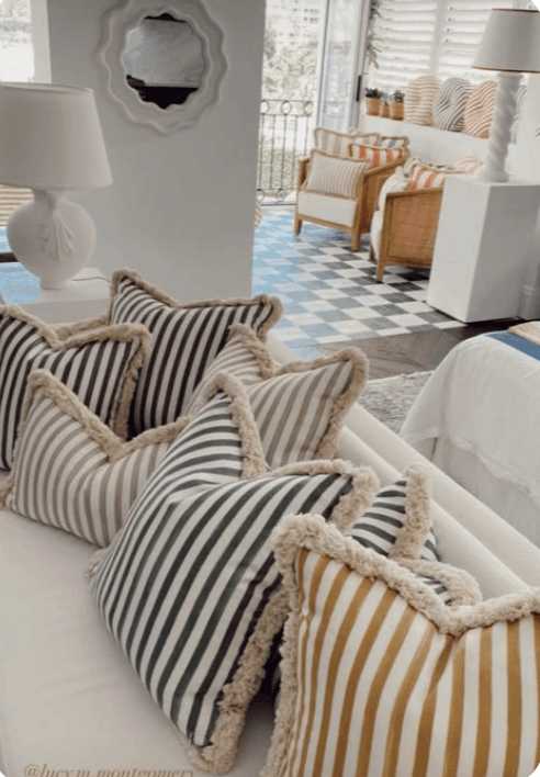 En espacios exteriores o zonas de paso, las rayas funcionan especialmente bien. Unas tumbonas con rayas clásicas en beige y blanco, unos cojines para tus sillas de exterior…… es esa vibra mediterránea que nunca falla.