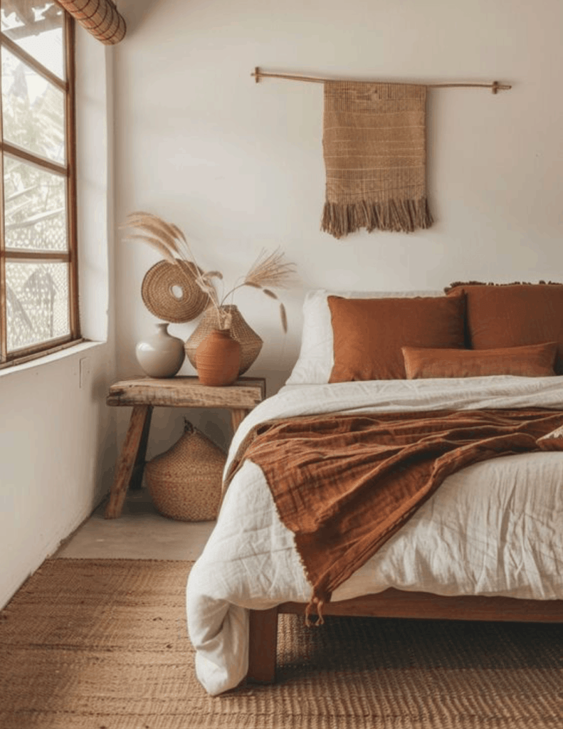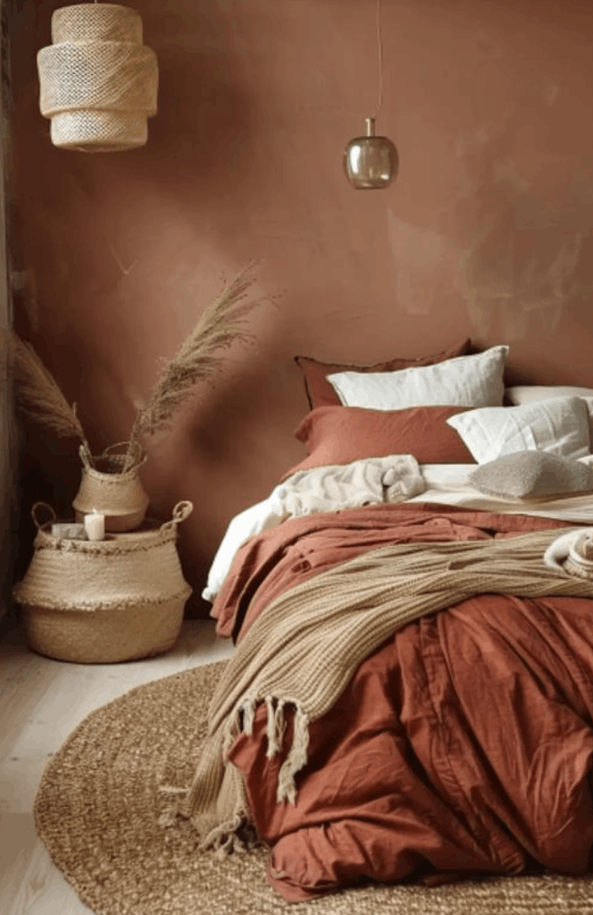 En el dormitorio, prueba con ropa de cama en este tono combinada con sábanas de lino blanco. El contraste es sutil pero efectivo, creando un ambiente relajante perfecto para el descanso. Y si tienes una habitación con mucha luz natural, el terracota potenciará aún más esa luminosidad, especialmente en las horas doradas del atardecer.