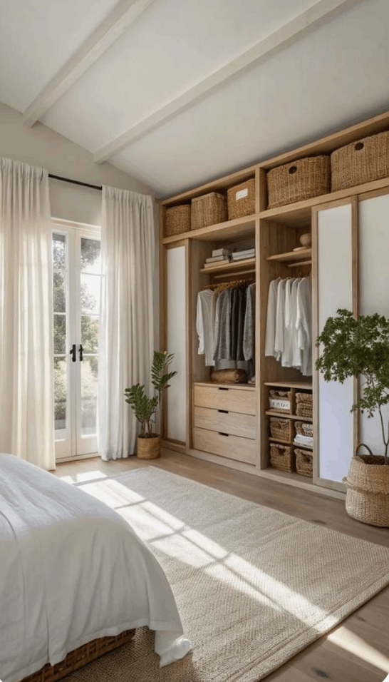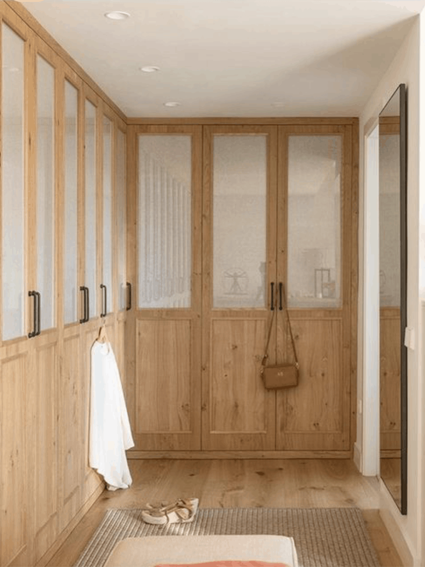 En estos casos, da prioridad a armarios de poco profundidad, puertas corredera y almacenamiento vertical. Un vestidor pequeño de 1,40 m x 2,20 m puede funcionar, siempre que permita una circulación mínima.