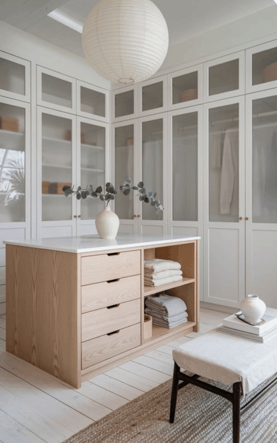 Y, por otro lado, si te gustaría poder instalar una isla en el centre de tu vestidor, el tamaño necesario será mucho mayor. Las medidas para un vestidor con isla aumentan hasta 9 o 10 m2 como mínimo, y generalmente consisten en una habitación con almacenaje en todos los lados, u una isla central con pasillos que la rodean.