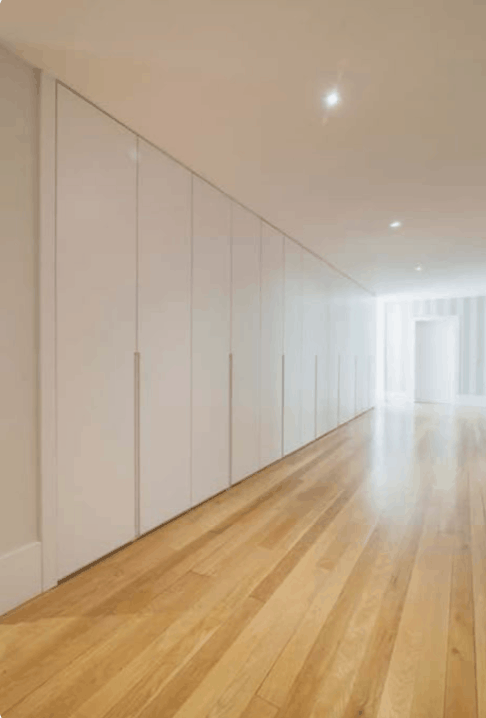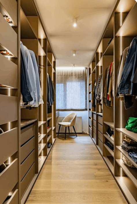 Normalmente, los planos de vestidores se diseñan con almacenaje en torno a un pasillo estrecho. El ancho del pasillo es uno de los puntos más importantes en las medidas de un vestidor. Para una circulación cómoda.